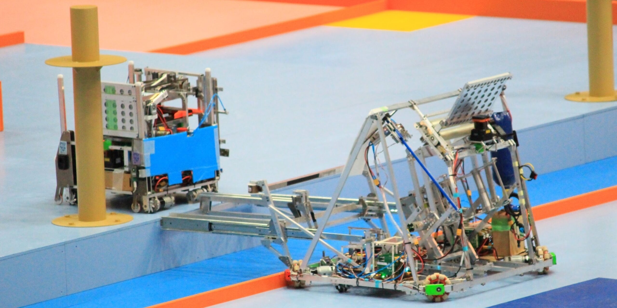 これが最終的なERです。肉抜きあとが美しいですね。メインとなる橋渡し機構は当初モーターで動かす想定でしたが、最終的には、定荷重ばねと呼ばれるばねで押し出すような機構になりました。また、現地でのフィールドの誤差なども考慮し、高さ調整ができるようにもしました。橋渡し機構は度重なる修正を繰り返し、一時はほとんど成功せず、二次ビデオ作製の遅延にも多分に影響を及ぼしました。前日練習でもなぜか成功しないという事態もありましたが、本番では二試合ともうまく機能してくれました。センターエリアの到達スピードは他大さんと比較しても早く、良い形で試合を始めることができたと思います。